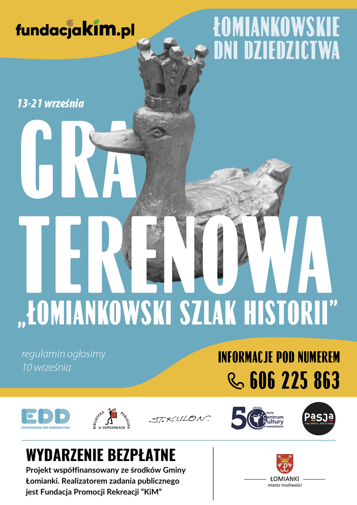 Wydarzenie bezpłatne. Projekt współfinansowany ze środków Gminy Łomianki. Realizatorem zadania publicznego jest Fundacja Promocji Rekreacji "KiM". Obowiązuje regulamin.