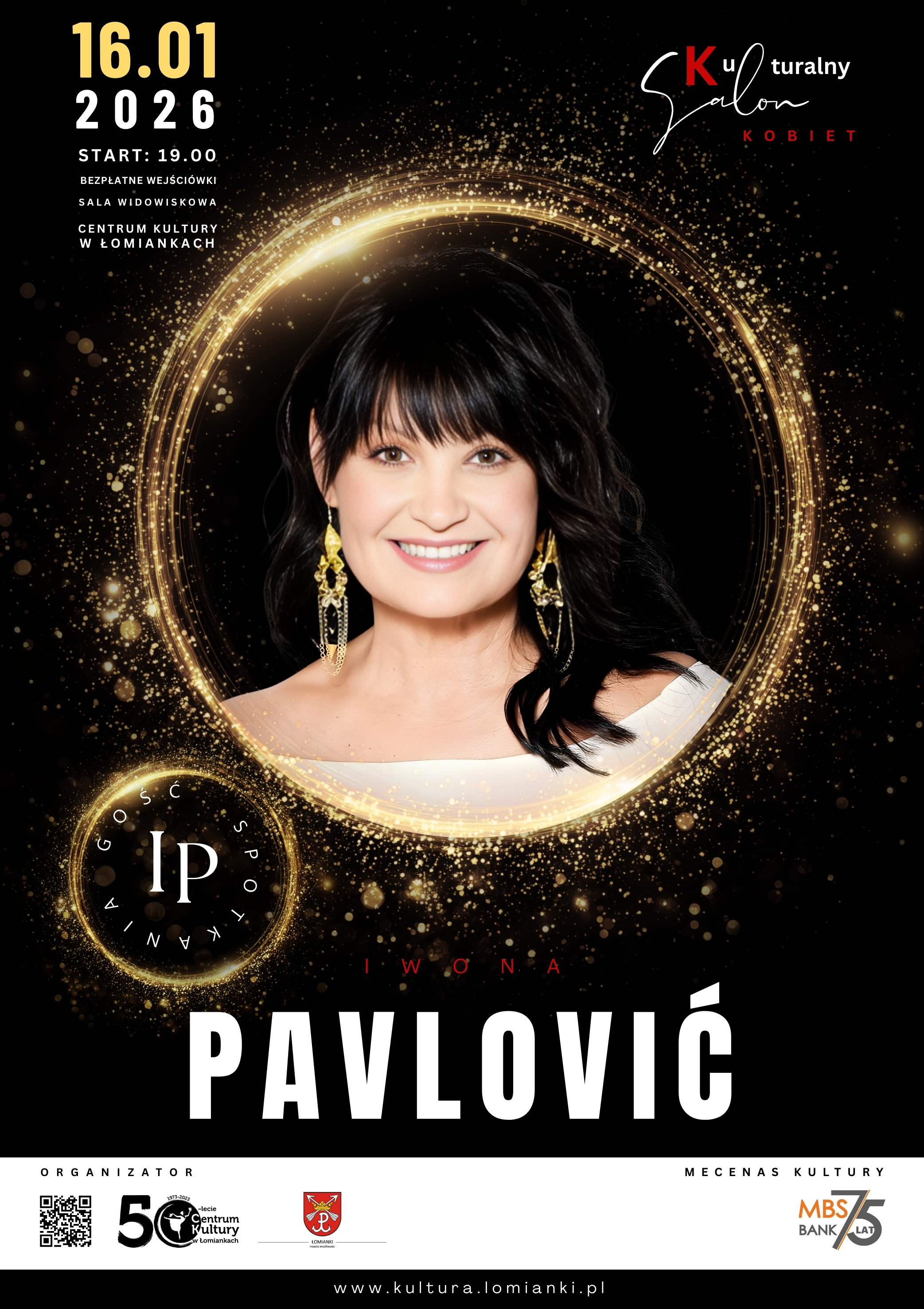 Zapraszamy na pierwsze spotkanie Kulturalnego Salonu Kobiet w 2026 roku. Naszym gościem będzie Iwona Pavlović – ikona tańca, telewizji i jedna z najmocniejszych osobowości polskiego show-biznesu.