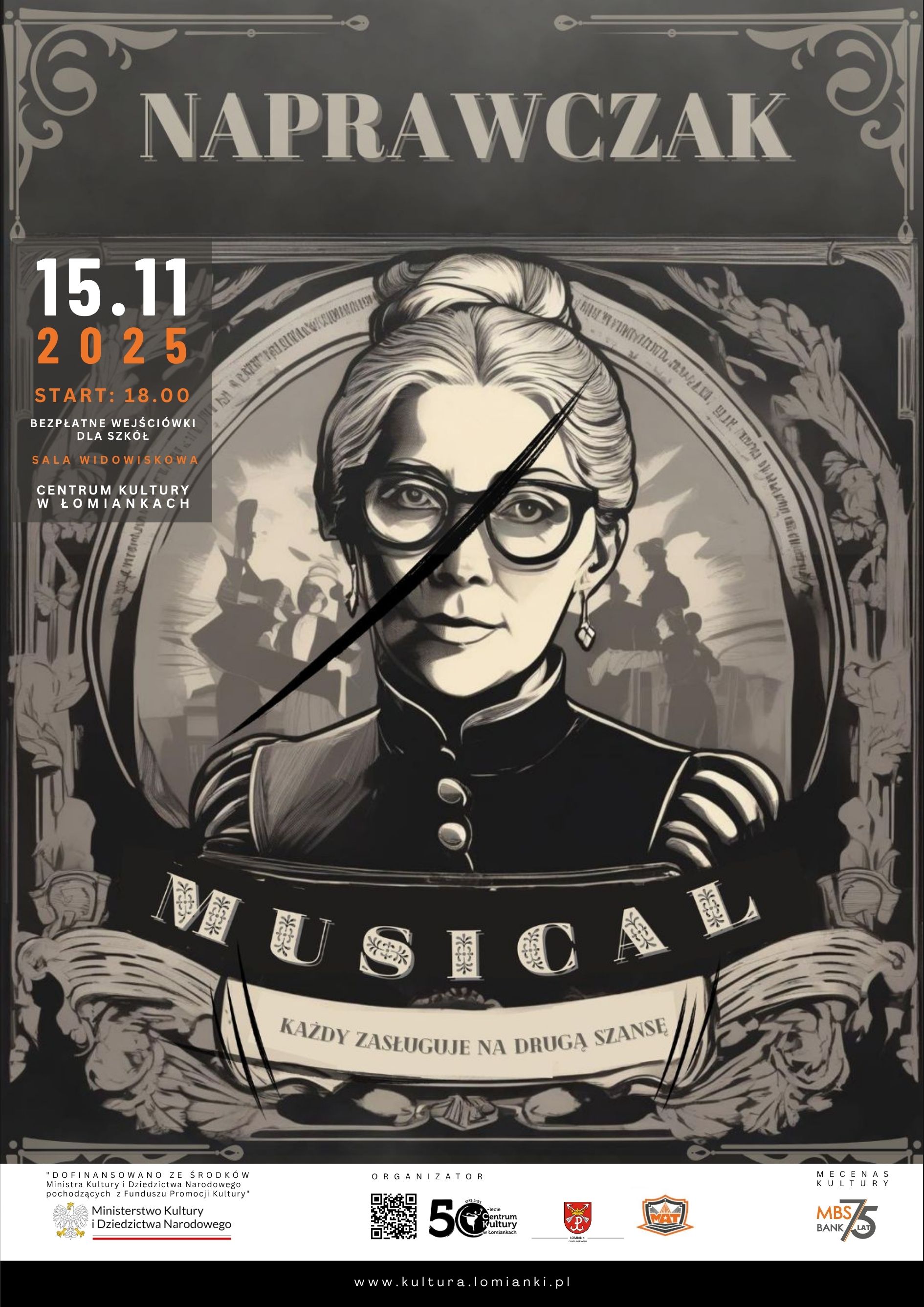 Wydarzenie objęte dofinansowaniem ze środków Ministra Kultury i Dziedzictwa Narodowego pochodzących z Funduszu Promocji Kultury w ramach programu "Wydarzenia artystyczne dla dzieci i młodzieży 2025" – bezpłatne wejściówki dla uczniów z Łomianek.